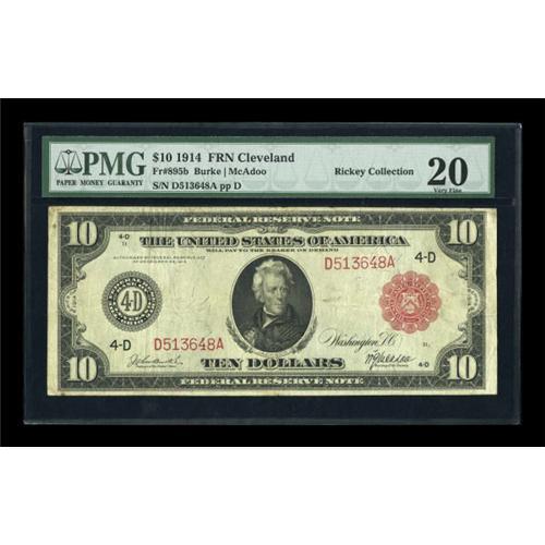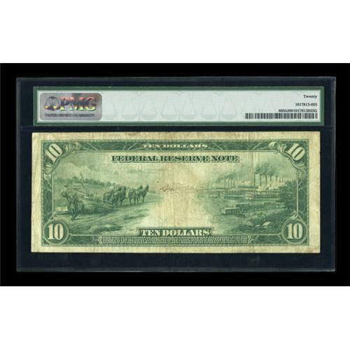 <B>Fr. 895b $10 1914 Red Seal Federal Reserve Note PMG Very Fine 20.</B></I> The red overprint is dark while upper serial number embossing is still retained by this $10. This is one of just 36 serial numbers in the census for this Friedberg number.<BR><BR><b>Shipping:</b> Coins & Currency (<a target="_blank" href="http://www.heritageauctions.com/common/shipping.php">view shipping information</a>)