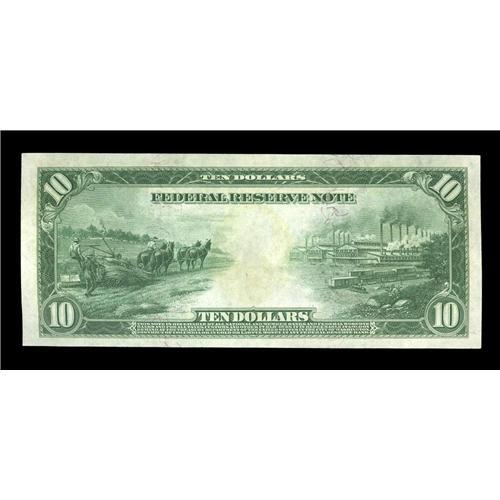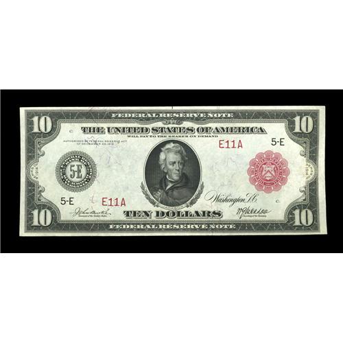 <B>Fr. 896a $10 1914 Red Seal Federal Reserve Note Choice About New.</B></I> Only ten examples are known of this Richmond District "a" type Red Seal Ten. This note, which is serial number 11, was purchased by our consignor from the Hickman & Oakes 1985 Memphis sale. It's a magnificent piece, with perfect color and the margins of a Superb Gem. Careful inspection discloses a well-hidden center fold.