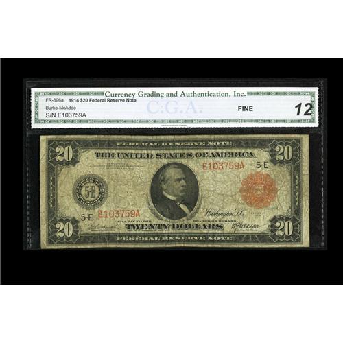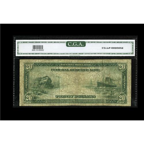 <B>Fr. 956a $20 1914 Red Seal Federal Reserve Note CGA Fine 12.</B></I> The holder incorrectly identifies the Friedberg number. Even with this new arrival to the census, the known number of survivors for this "A" variety remains fewer than a dozen. A few pinholes and moderate soiling are noted, but the red overprint remains bright.