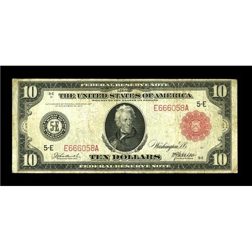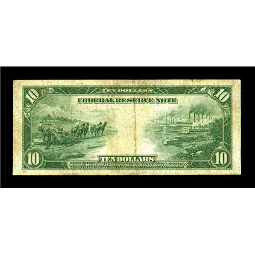 <B>Fr. 896b $10 1914 Red Seal Federal Reserve Note Fine.</B></I> Less than 15 serial numbers are recorded in the census for this Friedberg number. This note is one of those documented survivors. Two others are in government collections and two more have dropped out of sight since 1979. This leaves scant few to satisfy collector demand.<BR><I>From The Bill and Kathy Stella Currency Collection</B></I><BR><BR><b>Shipping:</b> Coin/Currency (<a target="_blank" href="http://www.heritageauctions.com/common/shipping.php">view shipping information</a>)