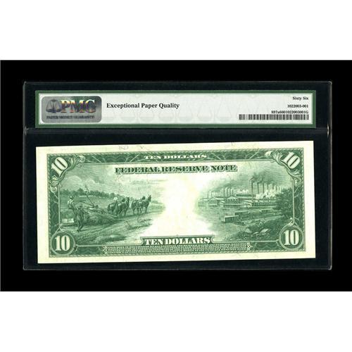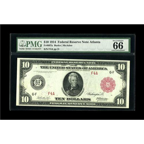 <B>Fr. 897a $10 1914 Red Seal Federal Reserve Note PMG Gem Uncirculated 66 EPQ.</B></I> This note originally came out of a Barney Bluestone sale in 1946 with a price realized of $28.50. In 1999 CAA realized a touch over $6000 for this piece. In 2007, where will the benchmark be set? A stunning single digit note that clearly has earned the grade assigned. The inks are fresh and the margins large. Expect the action to be fierce to take this prize home.<BR><BR><b>Shipping:</b> Coin/Currency (<a target="_blank" href="http://www.heritageauctions.com/common/shipping.php">view shipping information</a>)