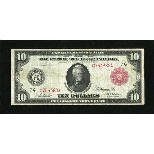 <B>Fr. 898a $10 1914 Red Seal Federal Reserve Note Very Fine.</B></I> The paper and overprint are ideal for the grade. A lone pinhole is noted, but does not affect the grade or eye appeal.<BR><I>From The Collection of Greg Southward</B></I><BR><BR><b>Shipping:</b> Coins & Currency (<a target="_blank" href="http://www.heritageauctions.com/common/shipping.php">view shipping information</a>)