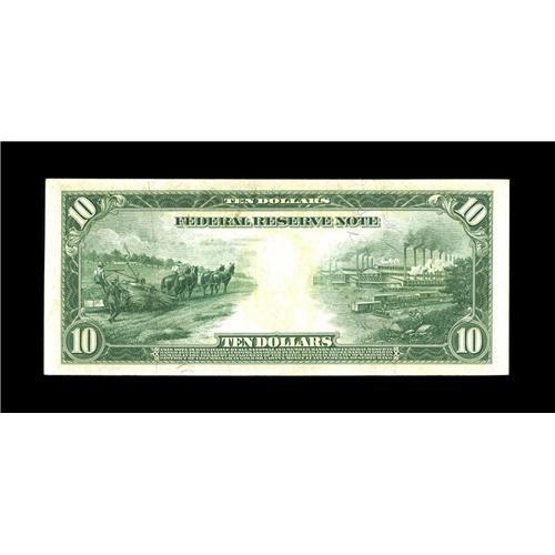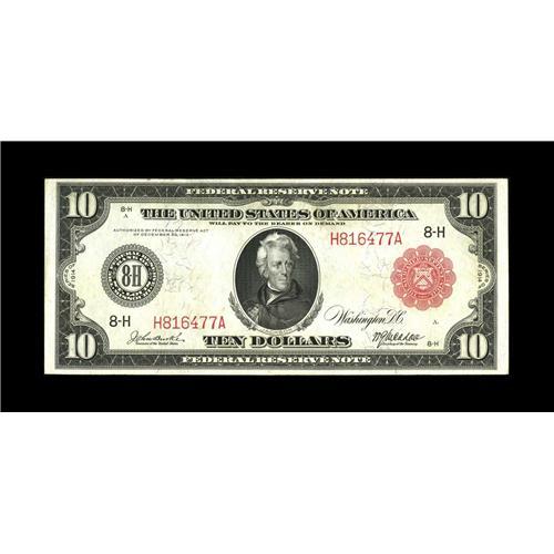 <B>Fr. 899b $10 1914 Red Seal Federal Reserve Note Extremely Fine.</B></I> This newly reported piece brings the surviving population of this Friedberg number to nine, three of which have never been offered for sale. Though a trifle flat this piece looks fully AU and retains its original color, including the rich red color of the overprint.<BR><BR><b>Shipping:</b> Coin/Currency (<a target="_blank" href="http://www.heritageauctions.com/common/shipping.php">view shipping information</a>)