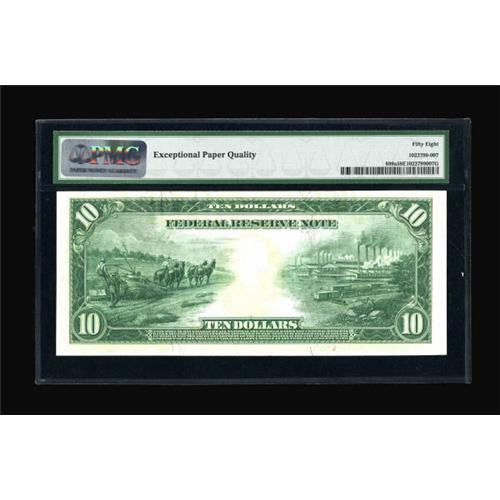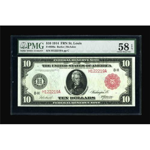 <B>Fr. 899a $10 1914 Red Seal Federal Reserve Note PMG Choice About Unc 58 EPQ.</B></I> From a run of notes that included the Burnside Collection piece, this pleasing example boasts generous margins, great color, and original surfaces. It has great eye appeal and should see some spirited competition to bring it home.<BR><BR><b>Shipping:</b> Coins & Currency (<a target="_blank" href="http://www.heritageauctions.com/common/shipping.php">view shipping information</a>)