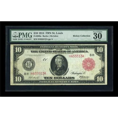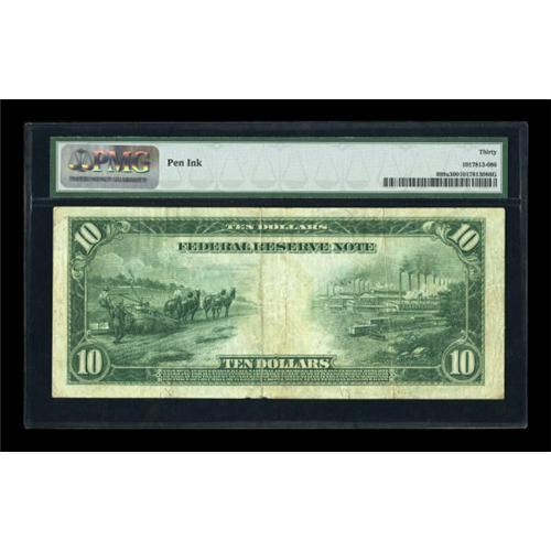 <B>Fr. 899a $10 1914 Red Seal Federal Reserve Note PMG Very Fine 30.</B></I> This is one of 38 in the census for Fr. 899a. However, only eight notes are listed with a higher grade than this example. The "pen ink" comment on the label refers to the "52" to the left of the portrait.<BR><BR><b>Shipping:</b> Coins & Currency (<a target="_blank" href="http://www.heritageauctions.com/common/shipping.php">view shipping information</a>)