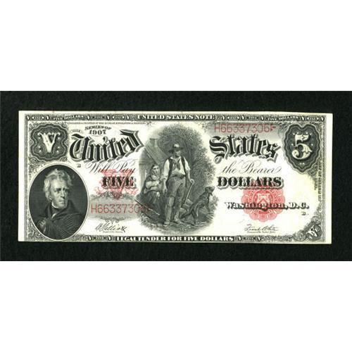 <B>Fr. 90 $5 1907 Legal Tender Very Fine+.</B></I> This Friedberg number is at least ten times scarcer than Fr. 91. Bright, white paper and dark inks complement each other on this nice mid-grade Woodchopper that exhibits a fair amount of folds. <BR><BR><b>Shipping:</b> Coins & Currency (<a target="_blank" href="http://www.heritageauctions.com/common/shipping.php">view shipping information</a>)