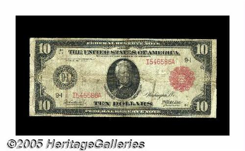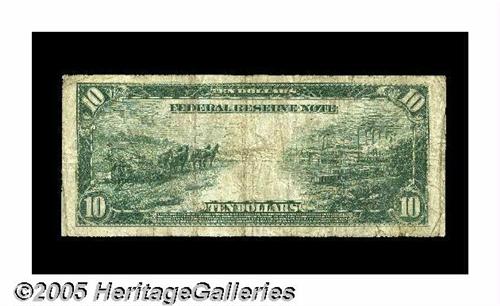 <B>Fr. 900b $10 1914 Red Seal Federal Reserve Note Fine.</B></I> Only about two dozen of the Fr. 900 are known, with the "a" variety outnumbering the "b" by a ratio of 3-1. While this note has its share of honest circulation soiling, it is scarce enough to sell for about...