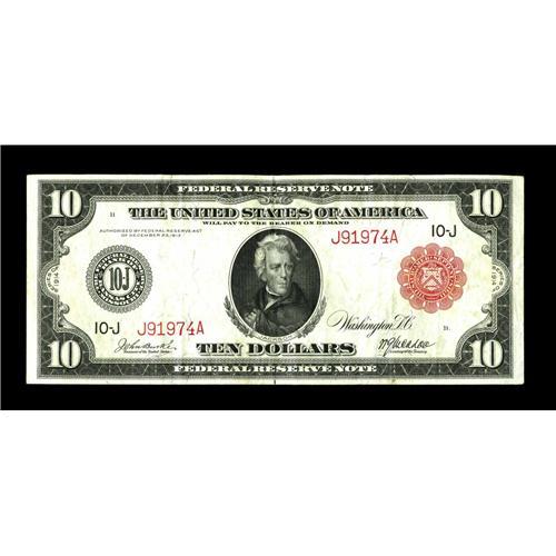 <B>Fr. 901a $10 1914 Red Seal Federal Reserve Note Very Fine.</B></I> There are less than two dozen of this Friedberg number listed in the census. White paper, a dark red overprint, and original paper surfaces define this $10 that has a pinhole in the portrait. Nonetheless, we have never sold a finer example of this number.<BR><I>From The Bill and Kathy Stella Currency Collection</B></I><BR><BR><b>Shipping:</b> Coin/Currency (<a target="_blank" href="http://www.heritageauctions.com/common/shipping.php">view shipping information</a>)