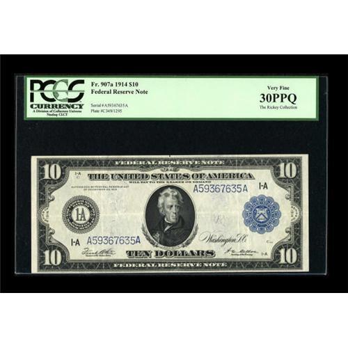 <B>Fr. 907a $10 1914 Federal Reserve Note PCGS Very Fine 30PPQ.</B></I> Perfectly original paper.<BR><BR><b>Shipping:</b> Coins & Currency (<a target="_blank" href="http://www.heritageauctions.com/common/shipping.php">view shipping information</a>)