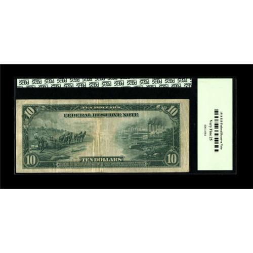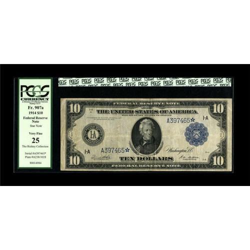 <B>Fr. 907a $10 1914 Federal Reserve Star Note PCGS Very Fine 25.</B></I> This nice mid-grade star with noticeable original paper surfaces is one of a dozen documented in the census for this Friedberg number. <BR><BR><b>Shipping:</b> Coins & Currency (<a target="_blank" href="http://www.heritageauctions.com/common/shipping.php">view shipping information</a>)