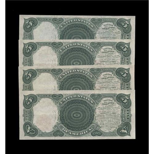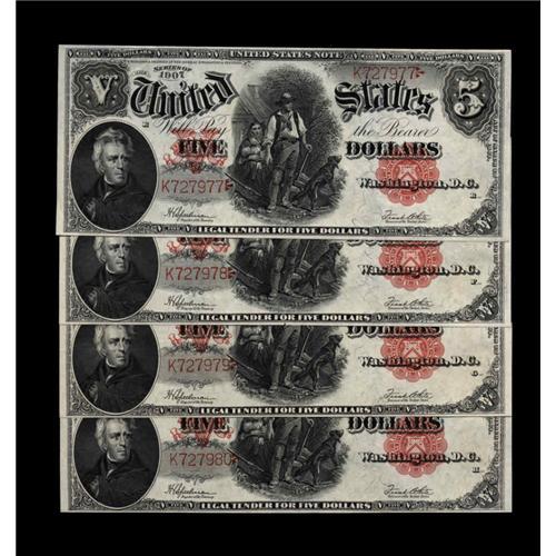 <B>Fr. 91 $5 1907 Legal Tender Cut Sheet of Four Gem New.</B></I> Amazingly bold original embossing highlights all four of these flashy Pioneer Fives. The margins are very nice for the type and, in spite of the fact that Fr. 91 is quite a common number, cut sheets are rarely seen.