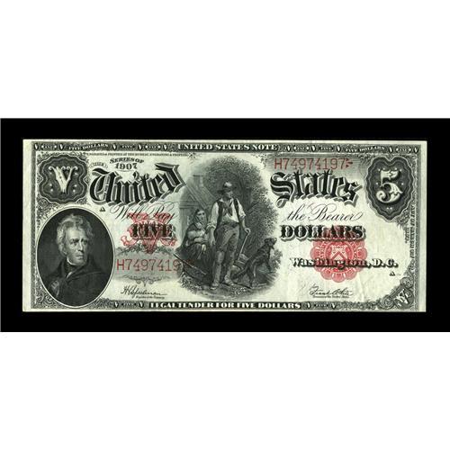 <B>Fr. 91 $5 1907 Legal Tender Extremely Fine.</B></I> This is a handsome Woodchopper. The paper is white and the overprint is dark red.<BR><BR><b>Shipping:</b> Coin/Currency (<a target="_blank" href="http://www.heritageauctions.com/common/shipping.php">view shipping information</a>)