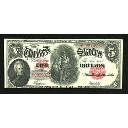 <B>Fr. 91 $5 1907 Legal Tender Extremely Fine.</B></I> Three folds can be counted on this lightly handled note.<BR><BR><b>Shipping:</b> Coins & Currency (<a target="_blank" href="http://www.heritageauctions.com/common/shipping.php">view shipping information</a>)