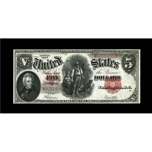 <B>Fr. 91 $5 1907 Legal Tender Gem New.</B></I> One could hope for wider horizontal margins, while everything else about this beautifully preserved Woodchopper is top rate.