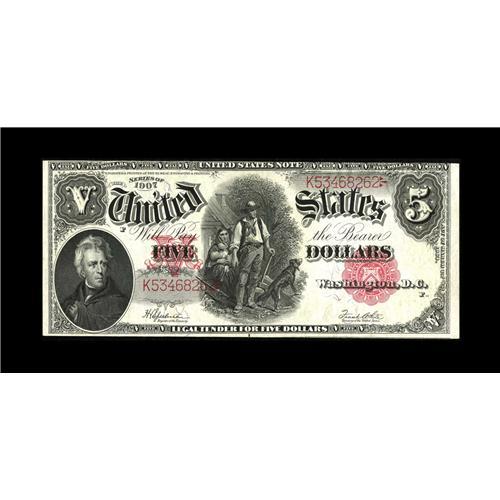 <B>Fr. 91 $5 1907 Legal Tender New.</B></I> The top margin restricts this note from a high uncirculated grade, which is unfortunate considering the originality and overall eye appeal of the note.<BR><BR><b>Shipping:</b> Coin/Currency (<a target="_blank" href="http://www.heritageauctions.com/common/shipping.php">view shipping information</a>)