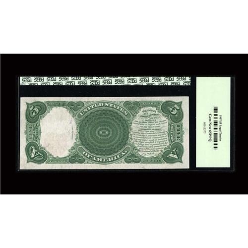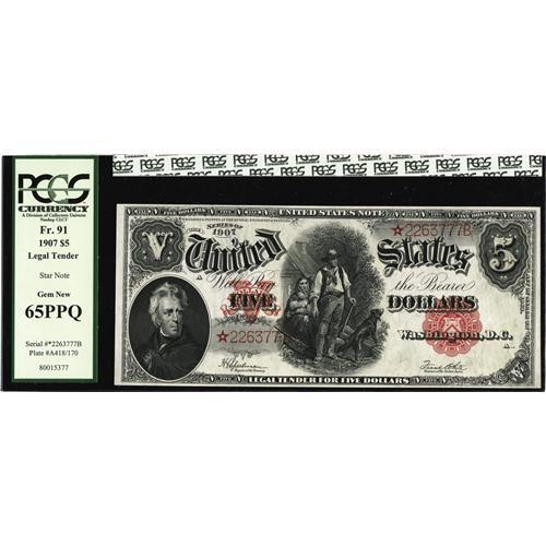<B>Fr. 91 $5 1907 Legal Tender Star Note PCGS Gem New 65PPQ.</B></I> An utterly flawless Star Note, with super centering, ideal color and pronounced original embossing. With over 70 examples known, there are not uncommon but very few of them are the equal of this piece for quality.
