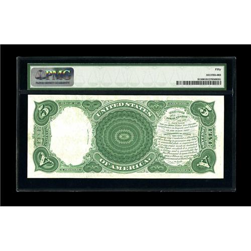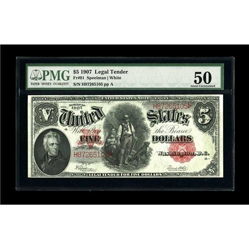 <B>Fr. 91 $5 1907 Legal Tender PMG About Uncirculated 50.</B></I> Great color abounds on this lightly circulated Woodchopper.<BR><BR><b>Shipping:</b> Coin/Currency (<a target="_blank" href="http://www.heritageauctions.com/common/shipping.php">view shipping information</a>)
