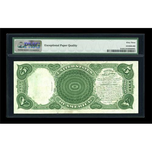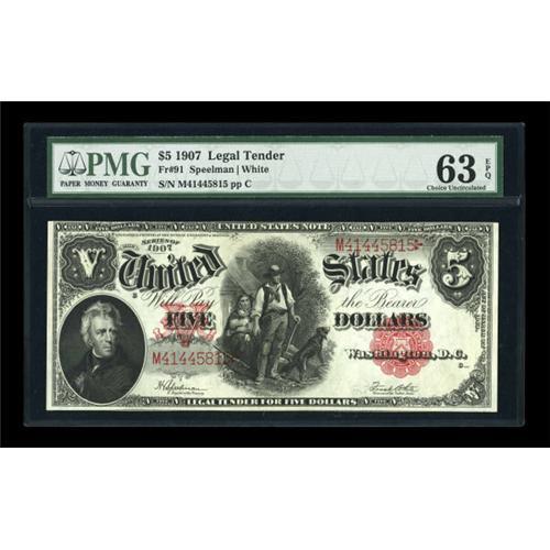 <B>Fr. 91 $5 1907 Legal Tender PMG Choice Uncirculated 63 EPQ.</B></I> A tight margin across the top is the reason for the grade on this bright, original Woodchopper.<BR><BR><b>Shipping:</b> Coins & Currency (<a target="_blank" href="http://www.heritageauctions.com/common/shipping.php">view shipping information</a>)