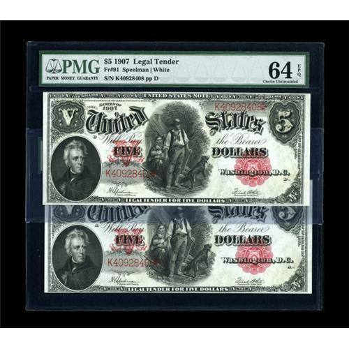 <B>Fr. 91 $5 1907 Legal Tenders Two Consecutive Examples PMG Choice Uncirculated 64 EPQ.</B></I> A little tightness along the bottom margin affects both of these crisp, bright notes.<BR><BR><b>Shipping:</b> Coins & Currency (<a target="_blank" href="http://www.heritageauctions.com/common/shipping.php">view shipping information</a>)