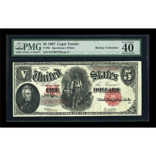 <B>Fr. 91 $5 1907 Legal Tender PMG Extremely Fine 40.</B></I> This three-fold example retains original embossing and bright paper.<BR><BR><b>Shipping:</b> Coins & Currency (<a target="_blank" href="http://www.heritageauctions.com/common/shipping.php">view shipping information</a>)
