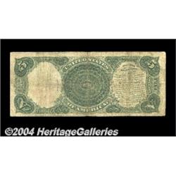 Fr. 91 $5 1907 Legal Tender Star Note Very Good-Fine. The most common of the Pioneer Stars with 73 notes listed in Murray. <BR><BR><B>Important notice:</B> Heritage usually auctions material at the rate of 200-250 lots per hour. On some occasions eBay Live bid software or the Internet may not be able to keep up with the pace of the auction. We recommend placing a realistic absentee bid now as insurance to avoid disappointment. Occasionally the auctioneer may eliminate or reject an eBay Live bid, and the auctioneer may also reopen a lot after the close of the eBay live bidding (usually because we missed an audience bid), and may reject your bid even if it shows you as the winning bidder. By bidding via eBay Live, you agree that Heritage may award the lot to another bidder at its sole discretion under the circumstances described above or any other reasonable circumstances. Since eBay bids are not shown to us until we open the lot on the floor, we treat those bids just like floor bids. In most cases the floor responds before the eBay bid is presented to us, due to Internet lag time, so for consistency we have made it a policy that floor bids are always considered first over tie eBay live bids. Also please note that all Heritage lots purchased through eBay Live carry a 20% Buyer's Premium. Please make sure you read the Terms and Conditions before you bid. <BR><BR><B>IMPORTANT ANNOUNCEMENT ABOUT RESERVES:</B> Heritage now divulges all reserves on its web site 7 days before every auction. If you want to know whether the reserve on this lot has been met, and if not, what the reserve amount is, please visit this lot page on the HeritageCoin.com web site, or email: bid@HeritageGalleries.com