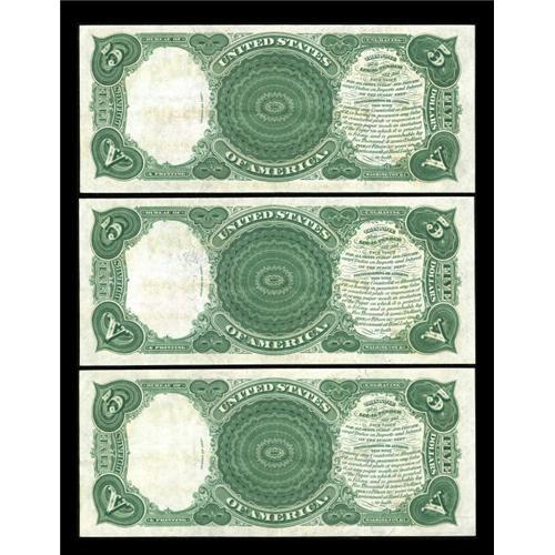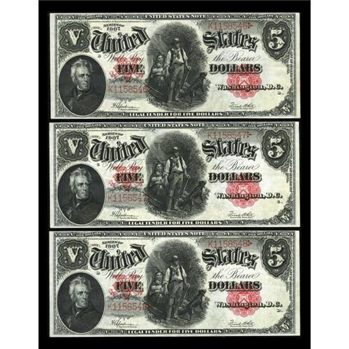<B>Fr. 91 $5 1907 Legal Tenders Three Consecutive Examples Very Fine-Extremely Fine.</B></I> This is a very crisp trio that is well embossed. Each note exhibits four folds, but is closer to the higher of the split grade in quality.<BR><BR><b>Shipping:</b> Coins & Currency (<a target="_blank" href="http://www.heritageauctions.com/common/shipping.php">view shipping information</a>)