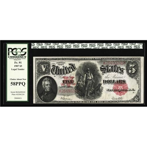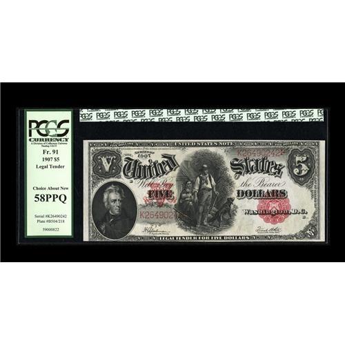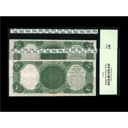<B>Fr. 91 $5 1907 Legal Tenders. Two Consecutive Examples. PCGS Choice About New 58PPQ.</B></I> A light center bend is visible though the third-party encapsulation.
