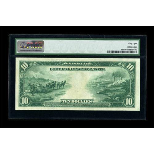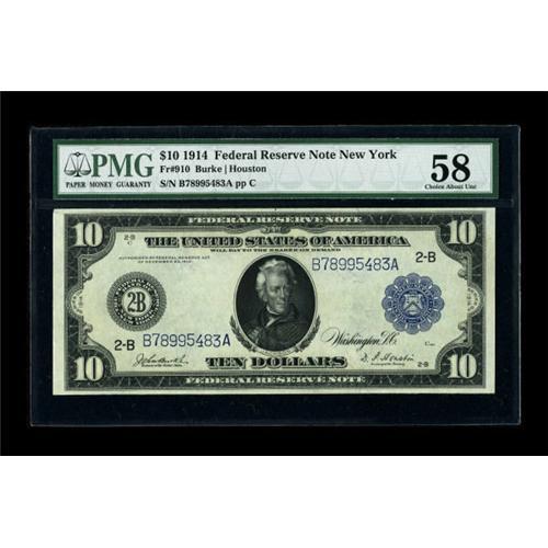 <B>Fr. 910 $10 1914 Federal Reserve Note PMG Choice About Unc 58.</B></I> A lightly handled example of a desirable Burke-Houston Big Apple issue.<B><BR></B></I><I>From The Drew Keough Collection</B></I><BR><BR><b>Shipping:</b> Coins & Currency (<a target="_blank" href="http://www.heritageauctions.com/common/shipping.php">view shipping information</a>)