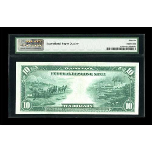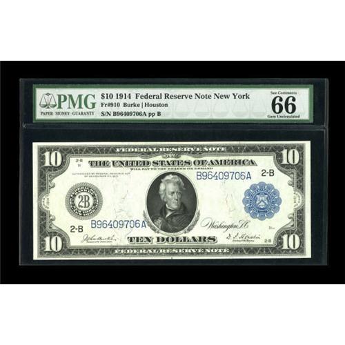 <B>Fr. 910 $10 1914 Federal Reserve Note PMG Gem Uncirculated 66 EPQ.</B></I> Deep embossing and solid margins are noted on this near-Superb issue.<BR><BR><b>Shipping:</b> Coins & Currency (<a target="_blank" href="http://www.heritageauctions.com/common/shipping.php">view shipping information</a>)