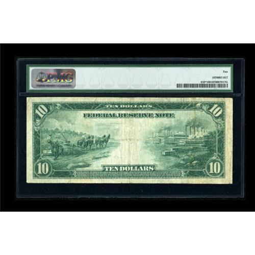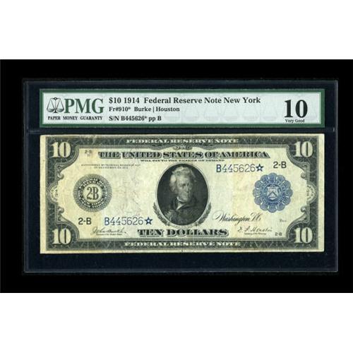 <B>Fr. 910 $10 1914 Federal Reserve Star Note PMG Very Good 10.</B></I> This is only the third time that this Friedberg number has appeared at auction with us in six years. Approximately twenty examples are known.<BR><BR><b>Shipping:</b> Coins & Currency (<a target="_blank" href="http://www.heritageauctions.com/common/shipping.php">view shipping information</a>)