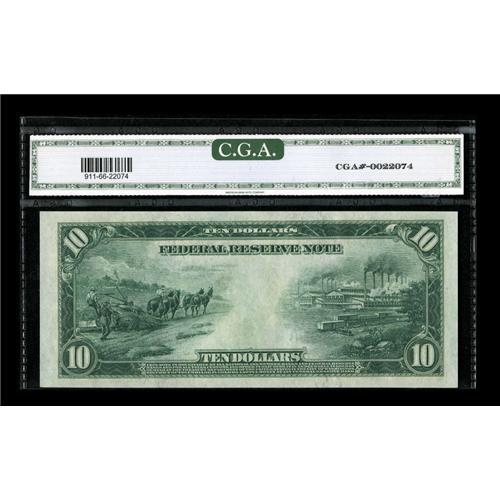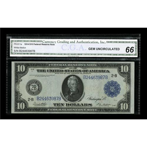 <B>Fr. 911a $10 1914 Federal Reserve Note CGA Gem Uncirculated 66.</B></I> Solid margins are noted all around the face design and the front to back centering is ideal. When viewed from the back, embossing is noted on the serial numbers. For those aficionados of minor errors, the right serial number is so irregular that is appears to be printed on a curve.<BR><BR><b>Shipping:</b> Coins & Currency (<a target="_blank" href="http://www.heritageauctions.com/common/shipping.php">view shipping information</a>)