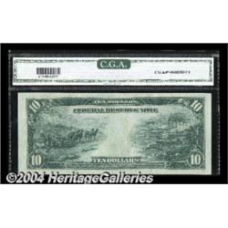 Fr. 911a $10 1914 Federal Reserve Note CGA Gem New 66. Huge margins, readily apparent deep original embossing and absolutely ideal colors all combine on this handsome third party graded Fed. For those aficionado of minor errors, the right serial number is so irregular that is appears to be printed on a curve. <BR><BR><B>Important notice:</B> Heritage usually auctions material at the rate of 200-250 lots per hour. On some occasions eBay Live bid software or the Internet may not be able to keep up with the pace of the auction. We recommend placing a realistic absentee bid now as insurance to avoid disappointment. Occasionally the auctioneer may eliminate or reject an eBay Live bid, and the auctioneer may also reopen a lot after the close of the eBay live bidding (usually because we missed an audience bid), and may reject your bid even if it shows you as the winning bidder. By bidding via eBay Live, you agree that Heritage may award the lot to another bidder at its sole discretion under the circumstances described above or any other reasonable circumstances. Since eBay bids are not shown to us until we open the lot on the floor, we treat those bids just like floor bids. In most cases the floor responds before the eBay bid is presented to us, due to Internet lag time, so for consistency we have made it a policy that floor bids are always considered first over tie eBay live bids. Also please note that all Heritage lots purchased through eBay Live carry a 20% Buyer's Premium. Please make sure you read the Terms and Conditions before you bid. <BR><BR><B>IMPORTANT ANNOUNCEMENT ABOUT RESERVES:</B> Heritage now divulges all reserves on its web site 7 days before every auction. If you want to know whether the reserve on this lot has been met, and if not, what the reserve amount is, please visit this lot page on the HeritageCoin.com web site, or email: bid@HeritageGalleries.com