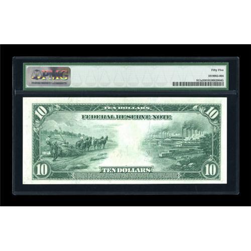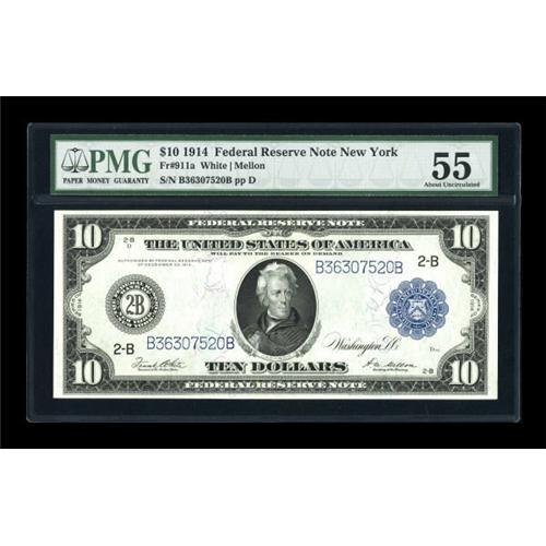 <B>Fr. 911a $10 1914 Federal Reserve Note PMG About Uncirculated 55.</B></I> This bright piece features nearly perfect margins on all sides, but is separated from a full Gem grade by a lone centerfold.<BR><BR><b>Shipping:</b> Coins & Currency (<a target="_blank" href="http://www.heritageauctions.com/common/shipping.php">view shipping information</a>)