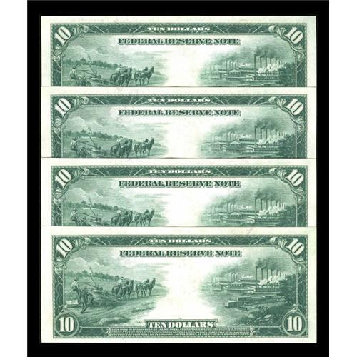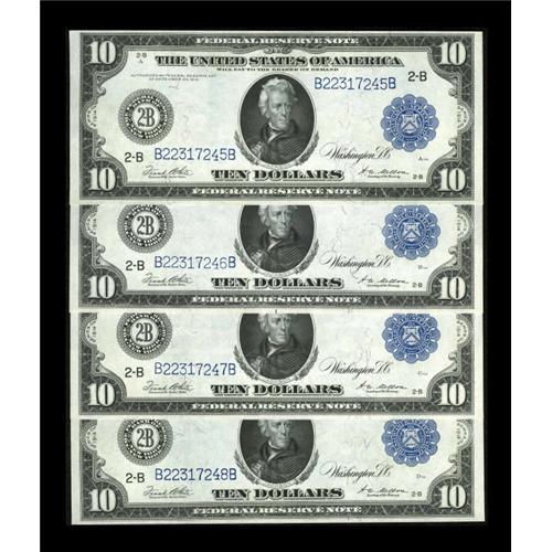 <B>Fr. 911a $10 1914 Federal Reserve Notes Cut Sheet of Four Choice About New.</B></I> This lovely cut sheet contains notes which were once folded and put away after their acquisition from the bank. Wonderful surfaces with plenty of bright color give the initial appearance of Choice.<BR><BR><b>Shipping:</b> Coins & Currency (<a target="_blank" href="http://www.heritageauctions.com/common/shipping.php">view shipping information</a>)