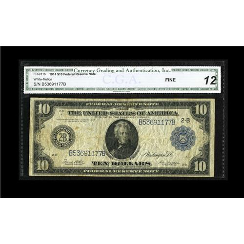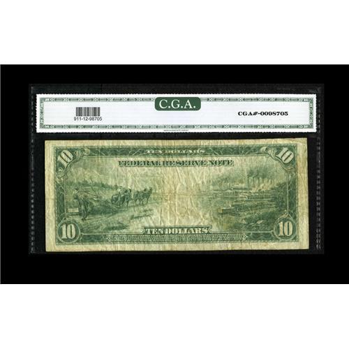 <B>Fr. 911b $10 1914 Federal Reserve Note CGA Fine 12.</B></I> A plethora of crinkles, not folds account for the grade.