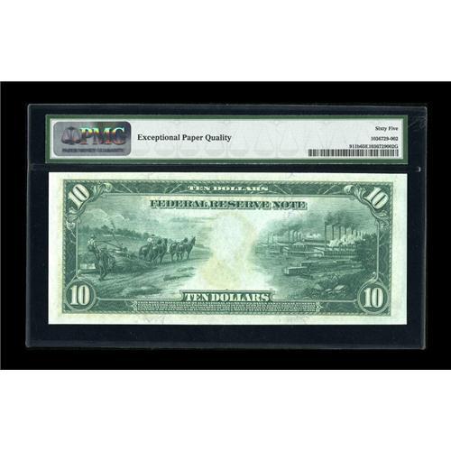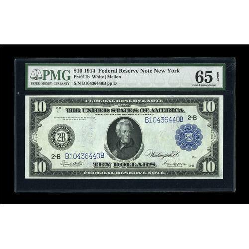 <B>Fr. 911b $10 1914 Federal Reserve Note PMG Gem Uncirculated 65 EPQ.</B></I> Broad margins and original paper surfaces highlight this New York $10.<BR><BR><b>Shipping:</b> Coins & Currency (<a target="_blank" href="http://www.heritageauctions.com/common/shipping.php">view shipping information</a>)