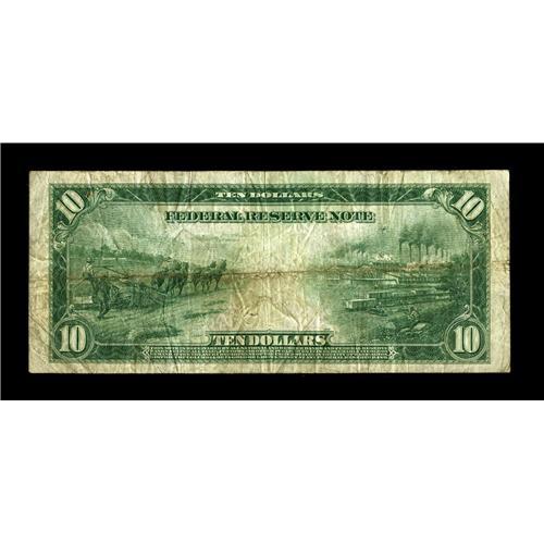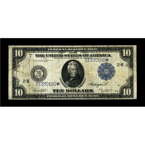 <B>Fr. 911c $10 1914 Federal Reserve Star Note Fine.</B></I> This pleasing example has only 13 listed in current census data. With the addition of values of early replacement notes to the Friedberg book expect values to rise dramatically. A couple of pinholes affect the surface. The margins remain strong on this piece which our consignor has owned since June of 1991.<BR><I>Ex: Doug Murray</B></I><BR><BR><b>Shipping:</b> Coin/Currency (<a target="_blank" href="http://www.heritageauctions.com/common/shipping.php">view shipping information</a>)