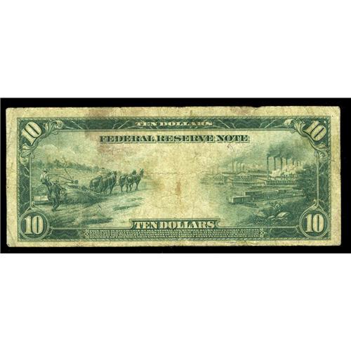 <B>Fr. 912* $10 1914 Federal Reserve Star Note Very Good.</B></I> The Murray census of Large Size Stars does not list any Stars for this Friedberg number, while the Gengerke census lists only one. That was a note that we sold at our January 2003 FUN auction. The example presented here is an exciting note, and now two collectors can possess an example of this rare Star.