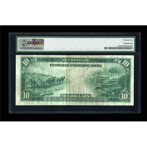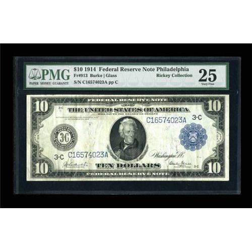 <B>Fr. 913 $10 1914 Federal Reserve Note PMG Very Fine 25.</B></I> Some crispness is still noticed beneath the holder on this Philly issue that carries the Burke/Glass signature combination.<BR><BR><b>Shipping:</b> Coins & Currency (<a target="_blank" href="http://www.heritageauctions.com/common/shipping.php">view shipping information</a>)