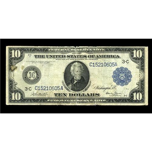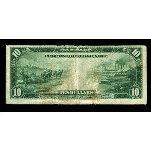 <B>Fr. 913 $10 1914 Federal Reserve Note Very Good.</B></I> This Philadelphia district Burke-Glass signature note is one of only six we have offered to date, with the total census standing at only twenty pieces in all grades.