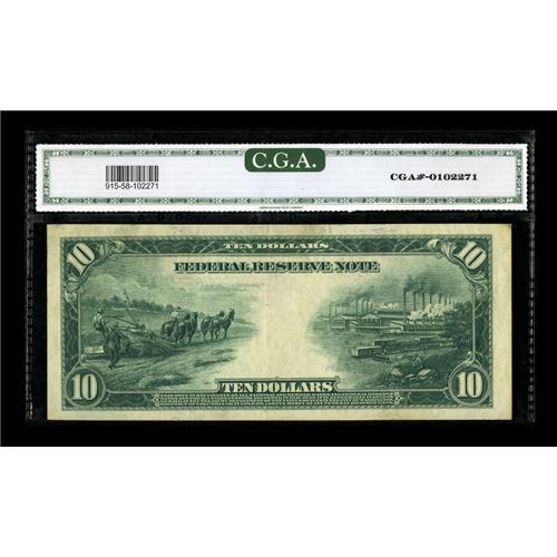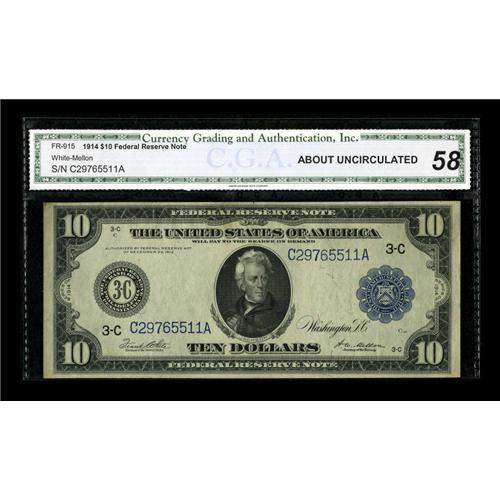 <B>Fr. 915a $10 1914 Federal Reserve Note CGA About Uncirculated 58.</B></I> Though the paper is a touch toned, it is fully New with the exception of a lone center fold.<BR><BR><b>Shipping:</b> Coins & Currency (<a target="_blank" href="http://www.heritageauctions.com/common/shipping.php">view shipping information</a>)