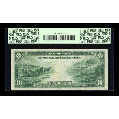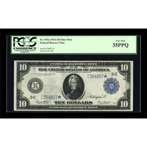 <B>Fr. 915a $10 1914 Federal Reserve Star Note PCGS Very Fine 35PPQ.</B></I> This is another star census anomaly, as this piece is listed as uncirculated, which, even with the most cursory of inspections, it clearly is not. It is, however, an attractive specimen which is one of only four reasonably high grade examples of this star number extant. <BR><I>From The Lawrence O'Neal Collection</B></I><BR><BR><b>Shipping:</b> Coins & Currency (<a target="_blank" href="http://www.heritageauctions.com/common/shipping.php">view shipping information</a>)
