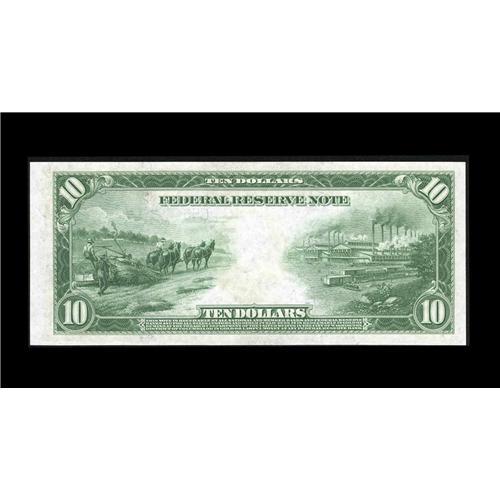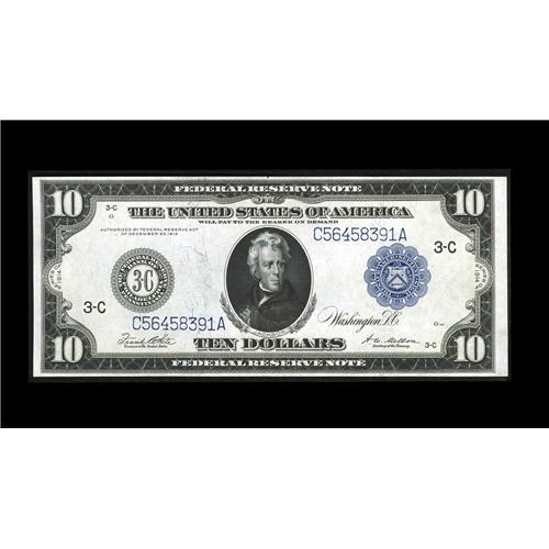 <B>Fr. 915c $10 1914 Federal Reserve Note Gem New.</B></I> A gorgeous example of this much scarcer "c"-type $10. Fewer than forty examples of the number are known in all grades combined, and it's certainly not likely that any of them surpass this well-centered, originally embossed beauty for either appearance or technical merit. If you have been looking for a "c"-type $10 for a type set, this is an ideal candidate.