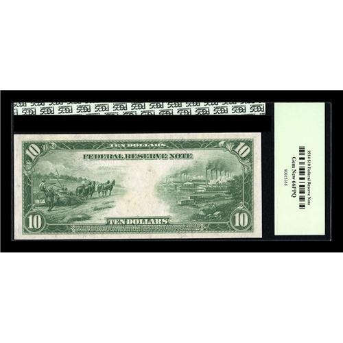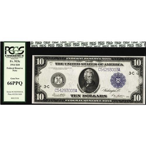 <B>Fr. 915c $10 1914 Federal Reserve Note PCGS Gem New 66PPQ.</B></I> From our 2006 Central States sale where it was described "This Philadelphia District example is the most common of the "c"-type Tens, although it is far from a common note with only about two dozen examples known in all grades combined. It's an ideal piece to represent this scarce type, as they simply do not come any finer. It's deeply originally embossed, with bright colors, ideal centering and super eye appeal." Nothing has changed our opinion.