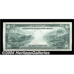 Fr. 918 $10 1914 Federal Reserve Note Choice About New. Only the eighth example that CAA has sold. The surfaces are strictly original, and the note is kept from the Choice grade by an extremely light vertical fold. <BR><BR><B>Important notice:</B> Heritage usually auctions material at the rate of 200-250 lots per hour. On some occasions eBay Live bid software or the Internet may not be able to keep up with the pace of the auction. We recommend placing a realistic absentee bid now as insurance to avoid disappointment. Occasionally the auctioneer may eliminate or reject an eBay Live bid, and the auctioneer may also reopen a lot after the close of the eBay live bidding (usually because we missed an audience bid), and may reject your bid even if it shows you as the winning bidder. By bidding via eBay Live, you agree that Heritage may award the lot to another bidder at its sole discretion under the circumstances described above or any other reasonable circumstances. Since eBay bids are not shown to us until we open the lot on the floor, we treat those bids just like floor bids. In most cases the floor responds before the eBay bid is presented to us, due to Internet lag time, so for consistency we have made it a policy that floor bids are always considered first over tie eBay live bids. Also please note that all Heritage lots purchased through eBay Live carry a 20% Buyer's Premium. Please make sure you read the Terms and Conditions before you bid. <BR><BR><B>IMPORTANT ANNOUNCEMENT ABOUT RESERVES:</B> Heritage now divulges all reserves on its web site 7 days before every auction. If you want to know whether the reserve on this lot has been met, and if not, what the reserve amount is, please visit this lot page on the HeritageCoin.com web site, or email: bid@HeritageGalleries.com