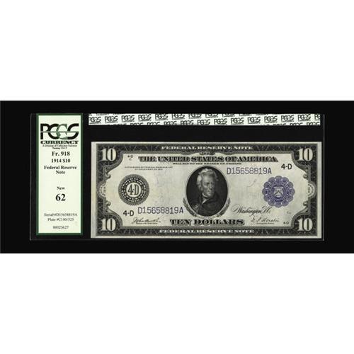<B>Fr. 918 $10 1914 Federal Reserve Note PCGS New 62.</B></I> Less than 40 examples are currently recorded in the Gengerke census for Cleveland Tens.