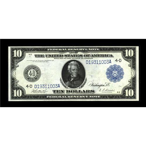 <B>Fr. 918 $10 1914 Federal Reserve Note Very Choice New.</B></I> A little too much handling for the Gem designation is noticed on this vibrantly hued note. Purchased by our consignor for $119 many years ago.<BR><BR><b>Shipping:</b> Coins & Currency (<a target="_blank" href="http://www.heritageauctions.com/common/shipping.php">view shipping information</a>)
