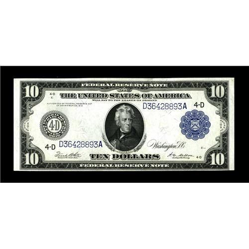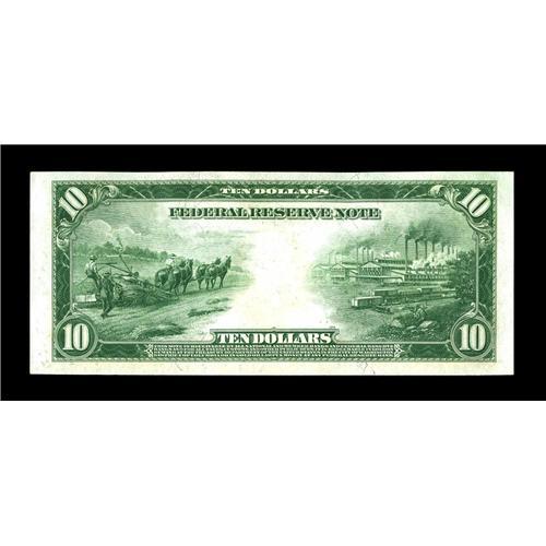 <B>Fr. 919a $10 1914 Federal Reserve Note Choice New.</B></I> Good paper originality and bold color highlight this Cleveland Ten. The note would be a perfect Gem were it not for the tight bottom margin.<BR><BR><b>Shipping:</b> Coin/Currency (<a target="_blank" href="http://www.heritageauctions.com/common/shipping.php">view shipping information</a>)