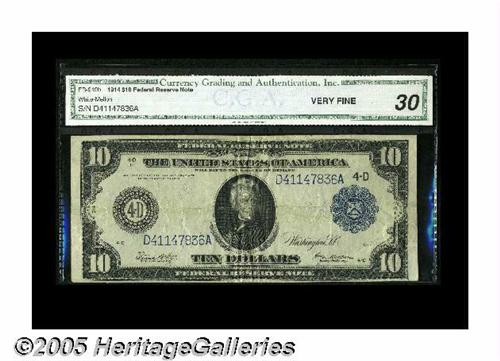 <B>Fr. 919b $10 1914 Federal Reserve Note CGA Very Fine 30.</B></I> Fewer than 20 examples are known of this number in all grades combined. This one is quite bright for the grade, with strong ink color.