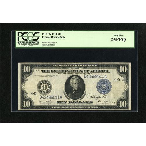 <B>Fr. 919c $10 1914 Federal Reserve Note PCGS Very Fine 25PPQ.</B></I> A picture perfect Very Fine with pleasing paper quality and a bold overprint. The holder indicates 919, though it should be 919c.<BR><BR><b>Shipping:</b> Coins & Currency (<a target="_blank" href="http://www.heritageauctions.com/common/shipping.php">view shipping information</a>)